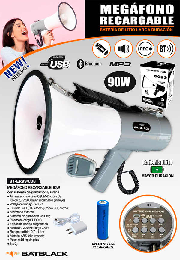 Megáfono Recargable 90W con Sistema de grabación y sirena