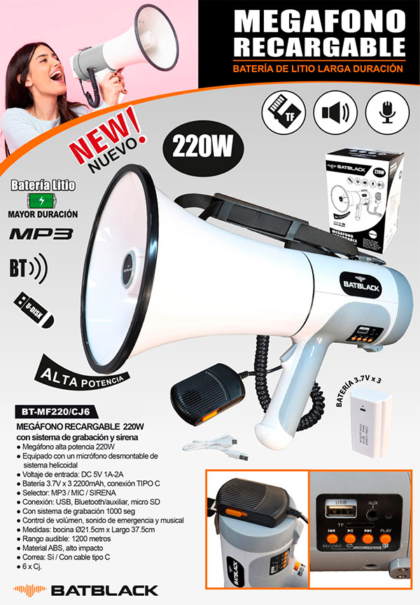 Megáfono Recargable 220W con sistema de grabación y sirena
