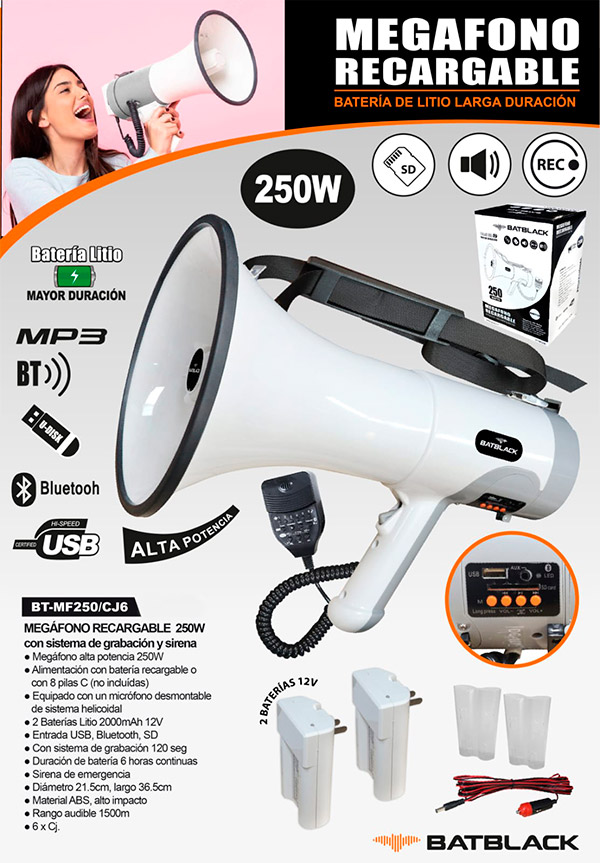 Megáfono Recargable 250W con sistema de grabación y sirena
