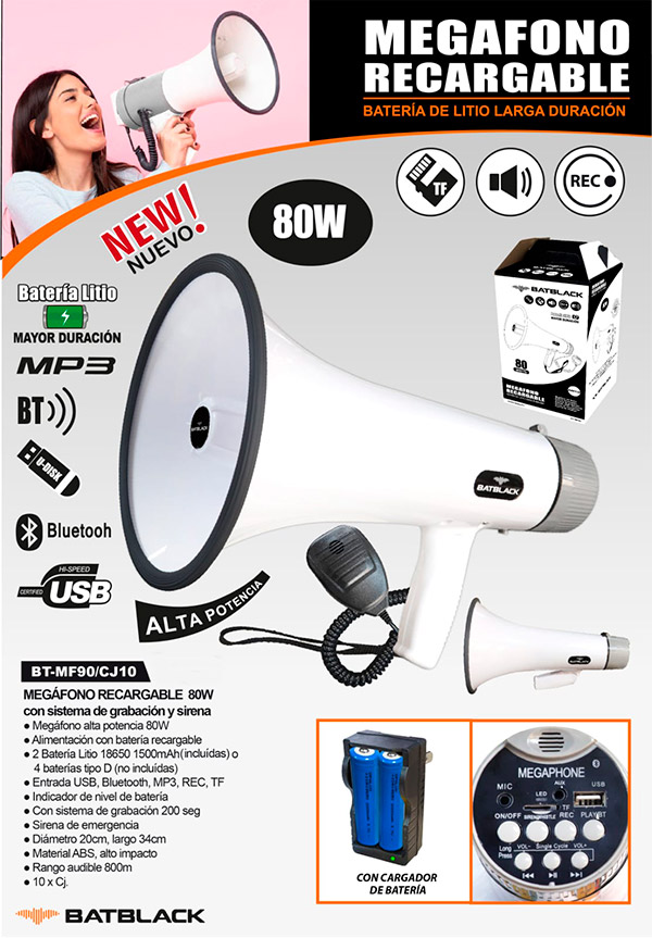 Megáfono Recargable 80W con Sistema de grabación y sirena