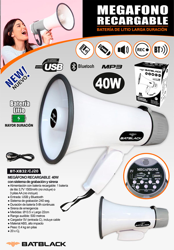 Megáfono Recargable 40W con sistema de grabación y sirena