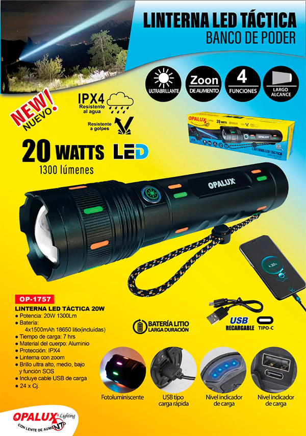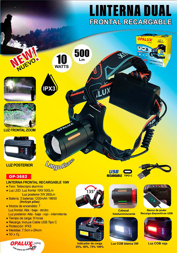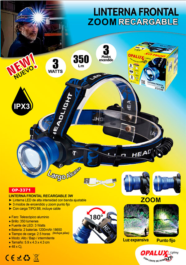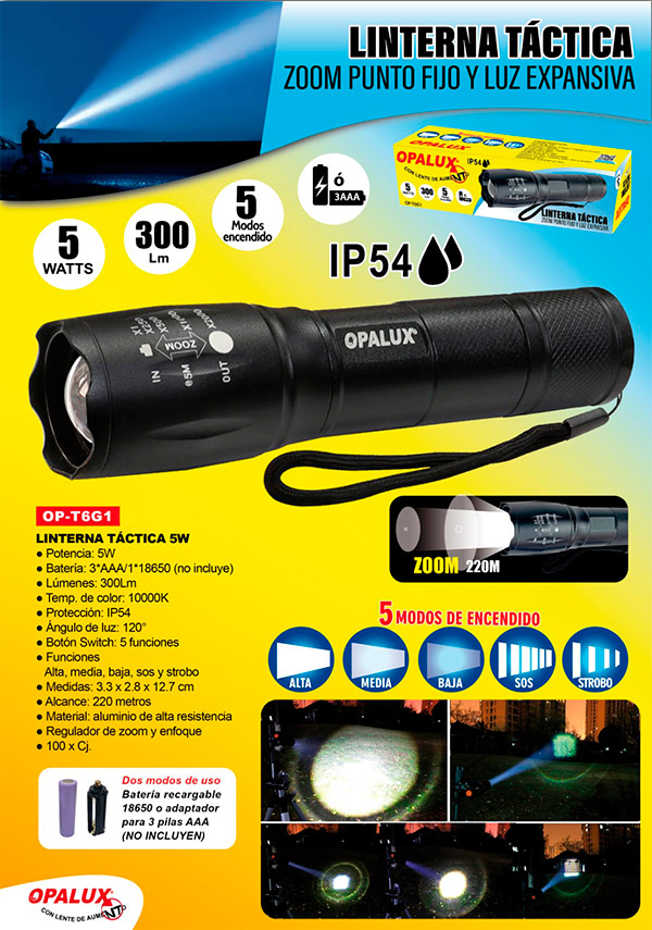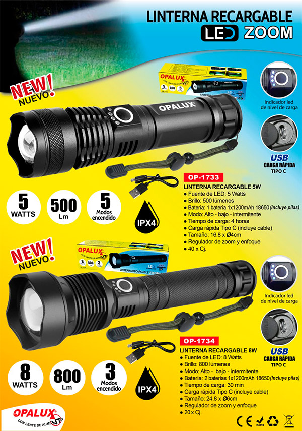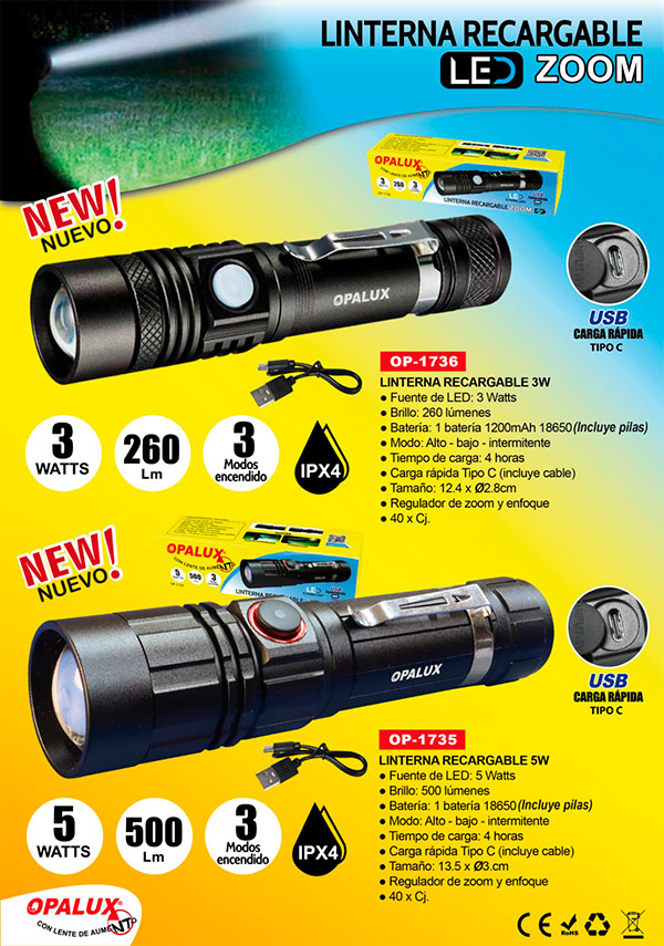 Linternas recargables LED 3W y 5W con Zoom y enfoque IPX4