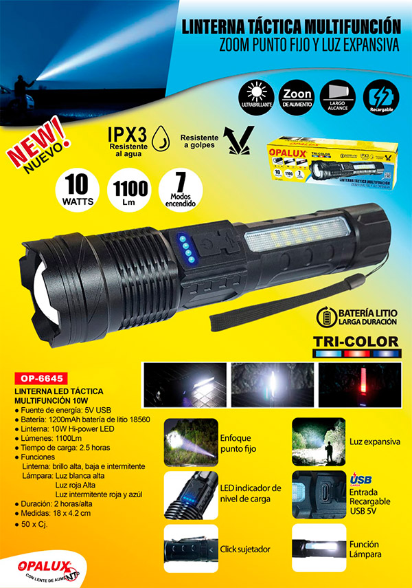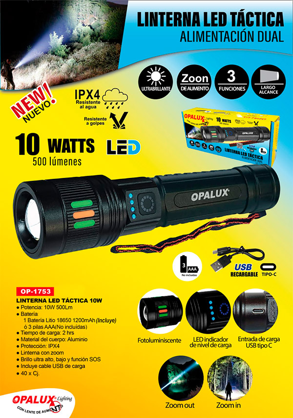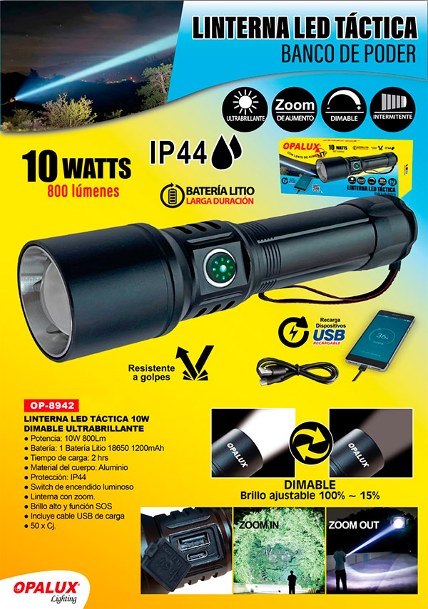 Linterna LED Táctica 10W dimable ultrabrillante IP44 con Zoom